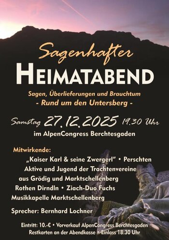 Der Trachtenverein D´Schellenberger lädt herzlich zu einem stimmungsvollen Abend mit Geschichten und Sagen rund um den Untersberg ein.
